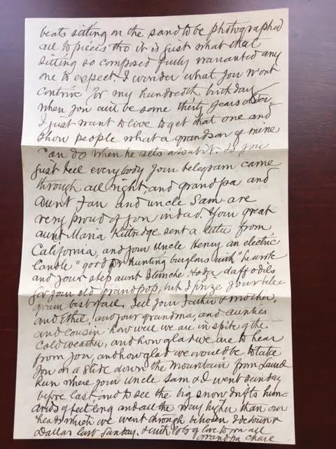 If you keep on at this pace, you will come out a regular racehorse of a man when full grown. You can hardly realize what an impression sending this telegram in your own name on behalf of the family has created here in the Welles Building and River Street. You really are a wonder and grandpa and you are going to be thicker than brothers. It beats sitting on the sand to be photographed all to pieces tho its is just what that sitting so composed fully warranted any one to expect. I wonder what you won’t contrive for my hundredth birthday when you will be some thirty years older. I just want to live to get that one and show people what a grandson of mine can do when he sets about it. So you just tell everyone your telegram came through all right, and grandpa and Aunt Fan and Uncle Sam are very proud of you indeed. Your great aunt Maria Kittridge sent a letter from California, and your Uncle Henry, an electric candle “good for hunting burglars with” he wrote, and your step aunt Blance Hodge daffodils for your old grandpop, but I prize your telegram best of all. Tell your Father and Mother and Ethel, and your grandma, and aunties and cousin how well we are in spite of the cold weather, and how glad we are to hear from you, and how glad we would be to take you on a slide down the Mountain from Laurel Run where your Uncle Sam and I went Sunday before last, and to see the big snow drifts hundreds of feet long and all the way higher than our heads, which we were through (_ town name_ ) and Dallas last Sunday.