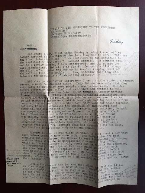See where I am! First thing Monday morning I sped off to fair Harvard to investigate the jobs they had to offer. This was the first interview I had. I am assistant to the assistant to the assistant to Dr. James B. Conant himself. It sounded fine and is a lovely office, I have discovered, and the people are most fascinating. But all I do for Dr. Conant is lick stamps and file cards. Later the job would involve keeping track of the mailing list of a booklet or two, watching supplies, etc. Actually the office is a fund-raising office (not an interest of mine).